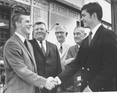 Coach Medling: Frayser tailback James Scott (Left) give Bishop Byrne tailback Mark Prudhomme (Right) a friendly handshake after the Memphis Quarterback Club meeting at the Chisca hotel whre tehy were named high school players of the week. With the football stars are Frayser coach Will Medling (Second Left), E.D. "Red" Cavette (Center), QB Club speaker and Bishop Byrne coach Hickman Ewing (Second Right). Barney Sellers / The Commercial Appeal files. |
