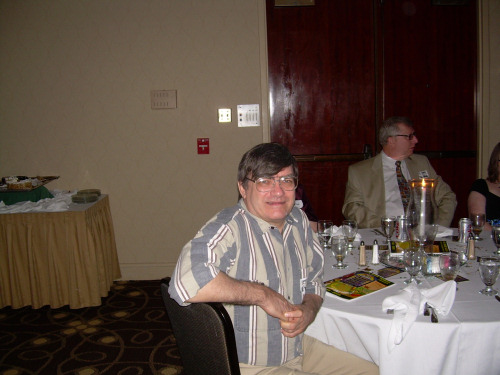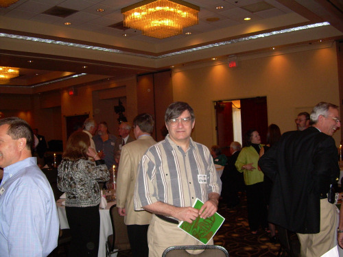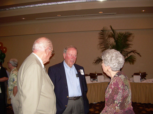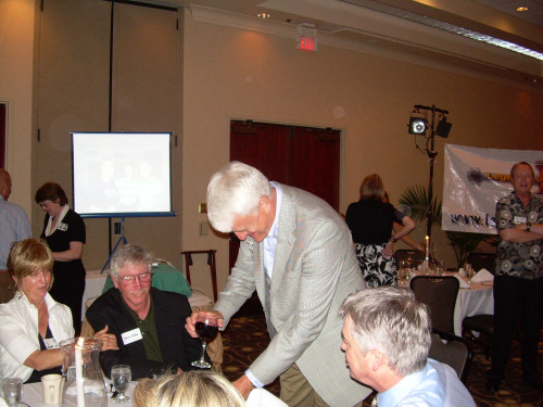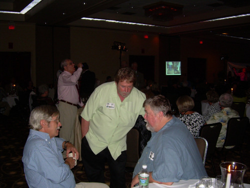 Nancy( Black) Shockley on Left, John Lyons & Kip McFarland on right John is either 1) Delivering a toast or 2) Stealing Kip's glass of wine...  |